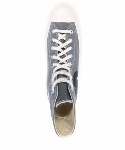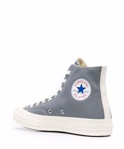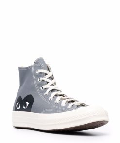 High Grey Cotton Converse ‘Chuck Taylor’ Sneakers from Comme Des Garçons Play. Featuring White Rubber Sole, a Contrasting Toe Cap, a Heart Print on the Side and a Lace-Up Front Fastening. We Recommend to Purchase One Size Down.