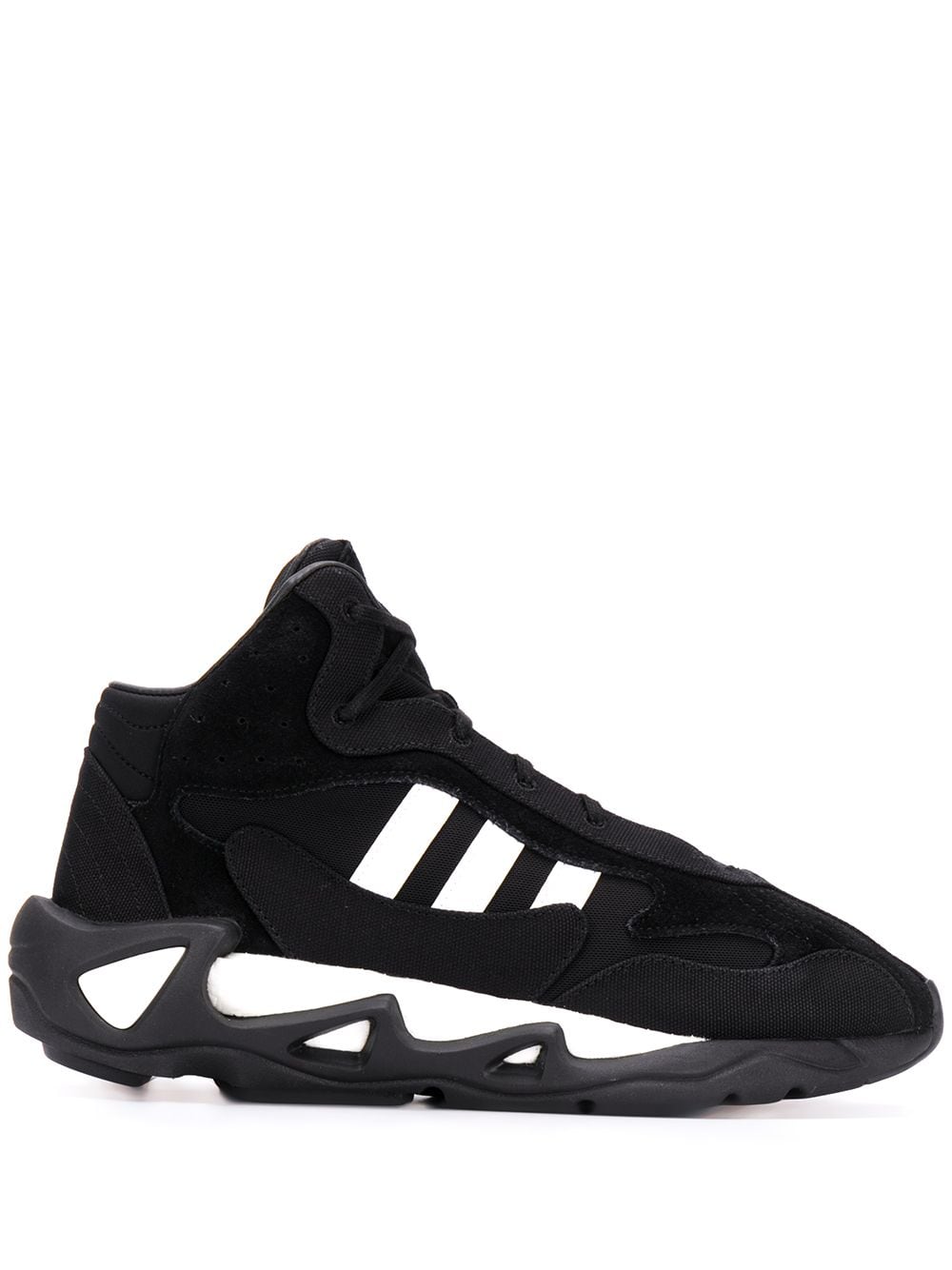 The FX1329 FYW S-97 II from Y-3 is a black and white suede sneaker with side stripe detailing, logo patch at the tongue, round toe and front lace-up fastening.